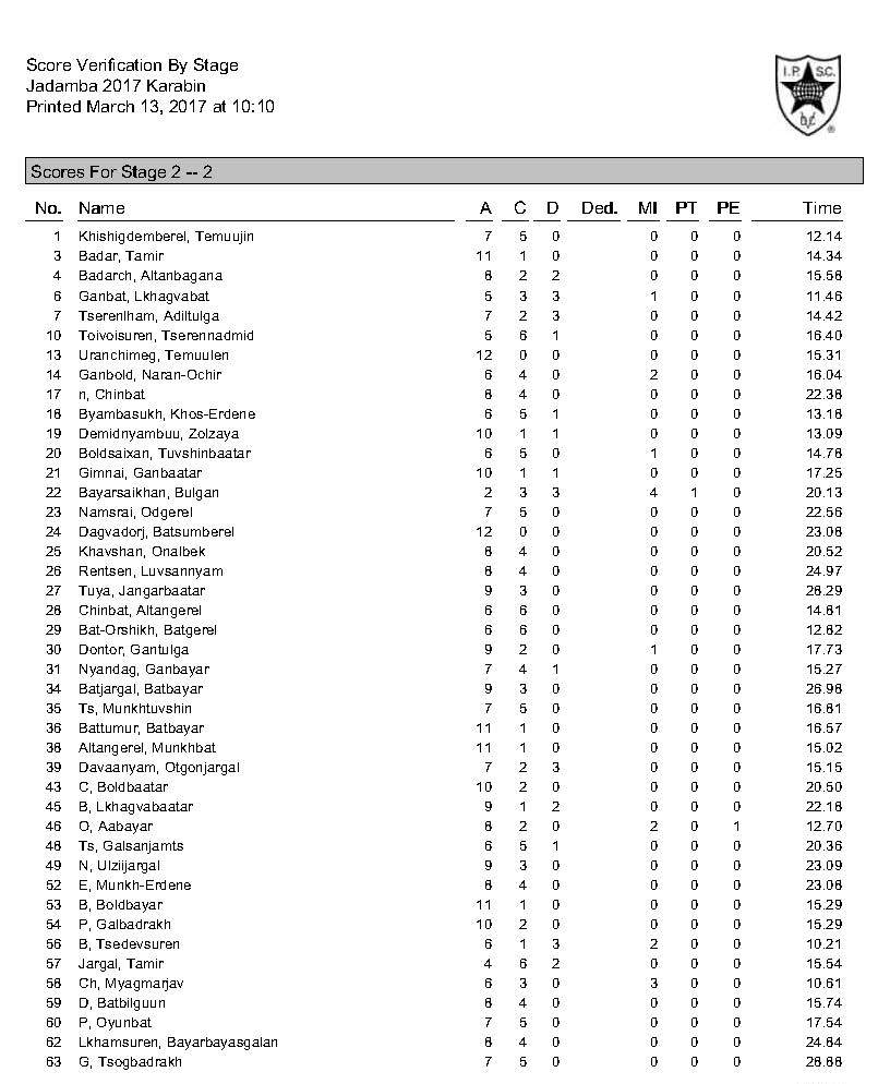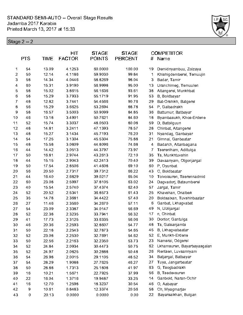 2-р дасгалын хувьд хамгийн цэцэн буудагчид нь боломжит 60 оноог бүрэн цуглуулж чадсан У.Тэмүүлэн, Д.Батсүмбэрэл нар байсан бол 10.21 секундэд дасгалыг гүйцэтгэсэн Б.Цэдэвсүрэн хамгийн богино хугацааны амжилтыг үзүүлжээ.