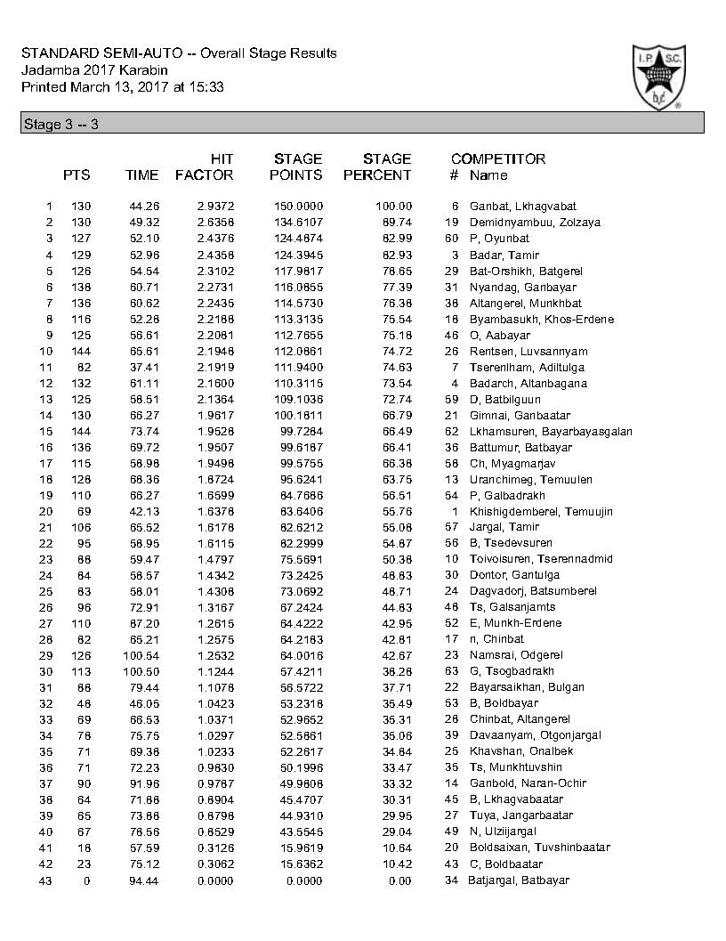 3-р дасгалын хувьд хамгийн хурдан буудагч нь 37.11 секундын хугацаанд дасгалыг бүрэн гүйцэтгэсэн спортын дэд мастер Ц.Адилтулга байсан бол боломжит 150 онооноос 144 оноо авсан Л.Баярбаясгалан, Р.Лувсанням нар хамгийн цэцэн буудагчид боллоо. Хэдийгээр 30 сумны тус дасгалд 27 альфа, 3 чарли авсан тэднээс 29 альфа авсан илүү Д.Батбилгүүн цэцэн буудсан мэт харагдаж буй боловч 1 бай оноогүйн улмаас илүү байж чадсангүй. Учир нь практик буудлагын спортын дүрэм ёсоор бай оноогүй болон торгуулийн бай оносон тохиолдол бүрт -5 оноо өгдөг тул тэрбээр боломжит 150 онооноос 140 оноо цуглуулсан байна.