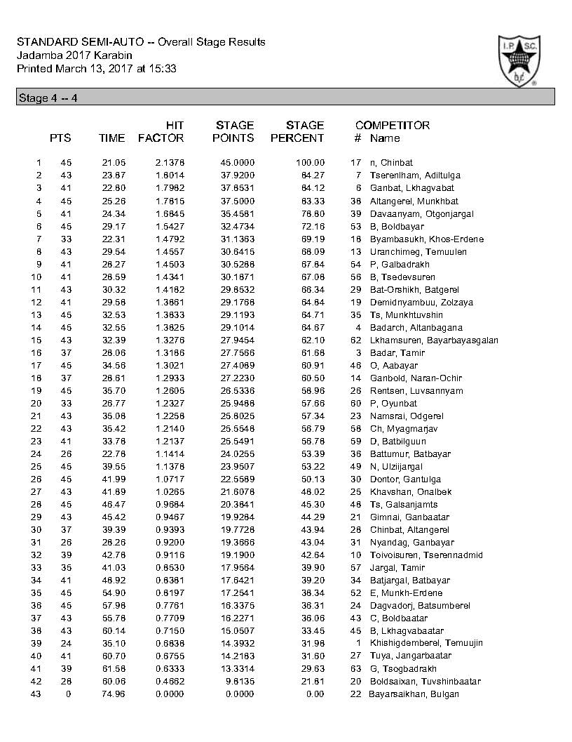 4-р дасгалын хувьд хэд хэдэн буудагчид боломжит 45 оноог бүрэн цуглуулсан боловч спортын мастер М.Чинбат хамгийн богино хугацаанд буюу 21.05 секундэд дасгалыг гүйцэтгэж, тухайн дасгалын хувьд 100% амжилт үзүүлжээ.