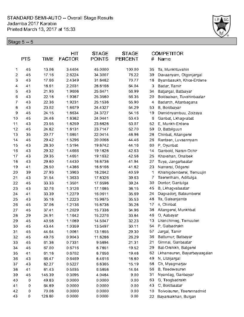 5-р дасгалын хувьд мөн хэд хэдэн буудагчид авах ёстой 45 оноог бүрэн цуглуулсан боловч Ц.Мөнхтүвшин хамгийн богино хугацаанд буюу 13.08 секундэд тус дасгалыг гүйцэтгэж, тухайн дасгалын хувьд 100% амжилт үзүүлэв.