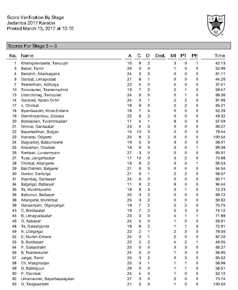 Ингээд тус дасгалд тамирчдыг үзүүлсэн амжилтаар нь эрэмбэлэхэд спортын дэд мастер Г.Лхагвабат 100%-ийн амжилт үзүүлж, 3-р дасгалыг тэргүүлсэн байна.