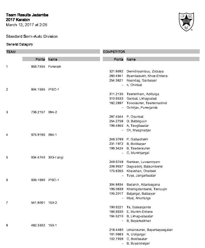 Практик буудлагын спортын дүрэм ёсоор багийн дүнг тухайн багийн 4 гишүүний 3-ынх нь авсан онооны нийлбэрээр тооцдог.