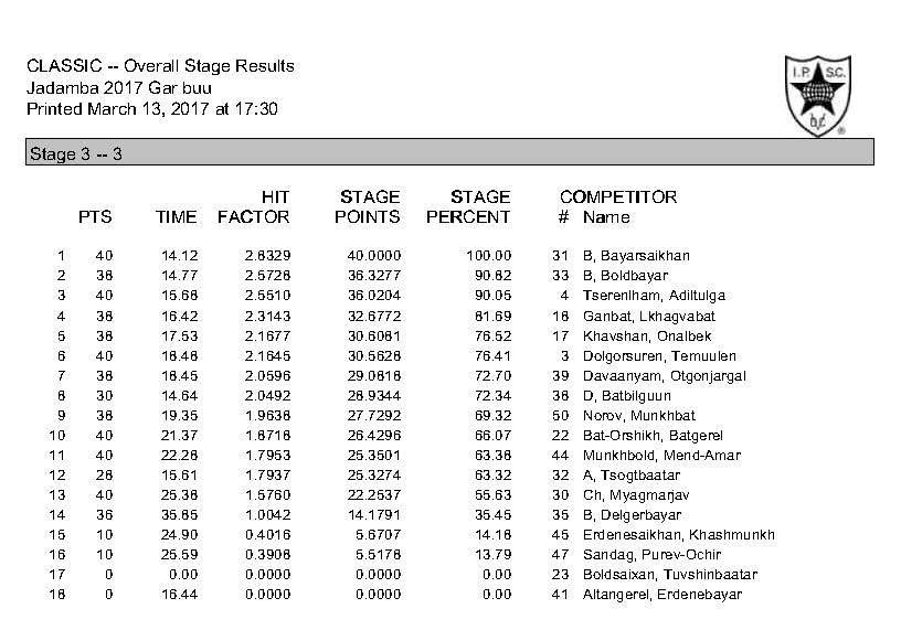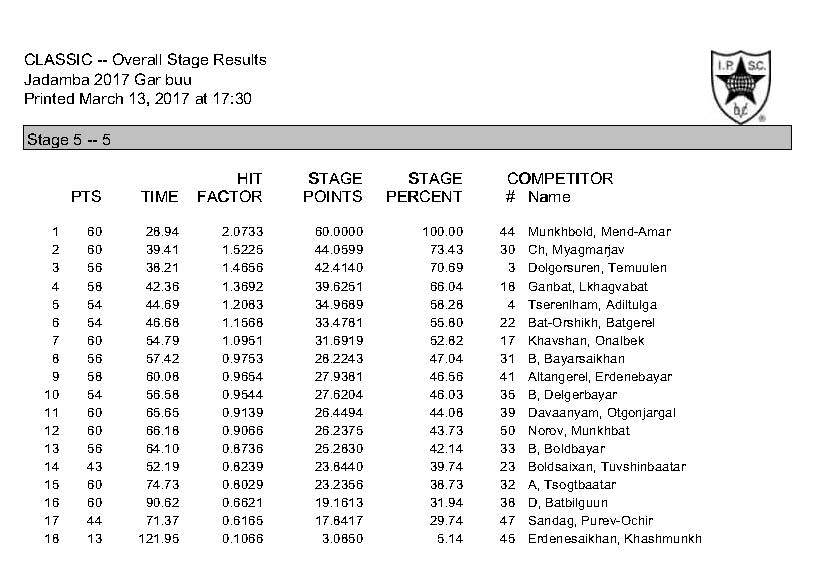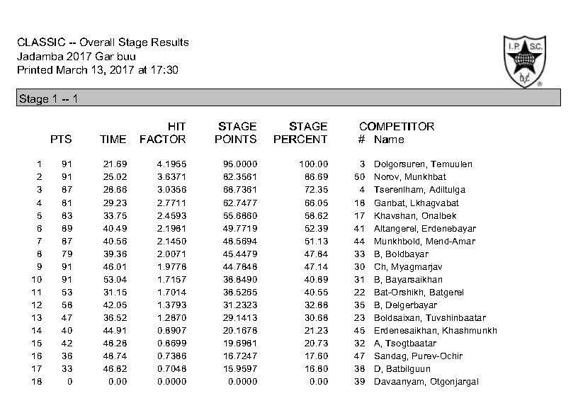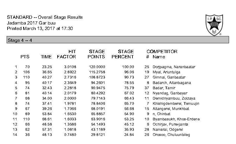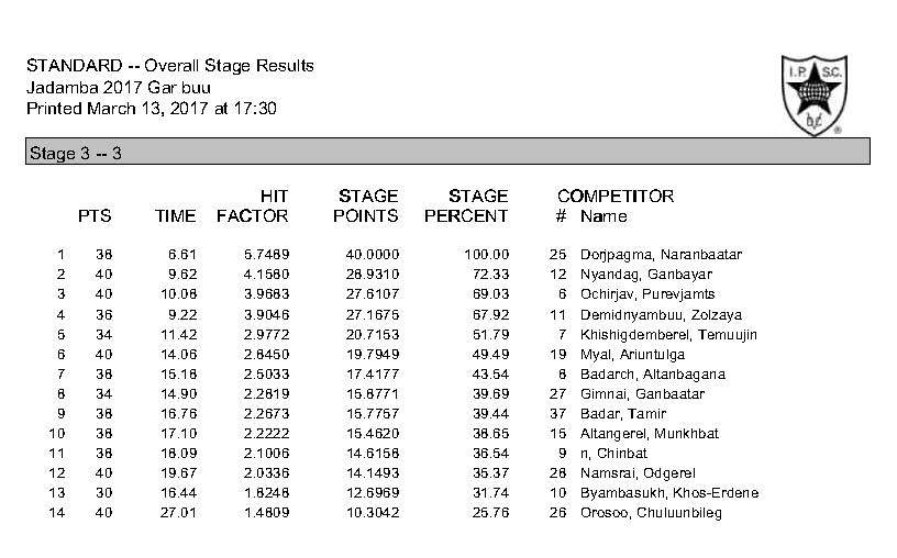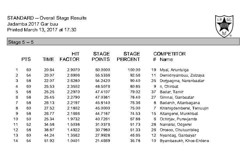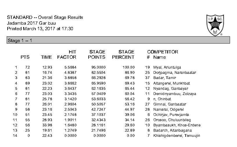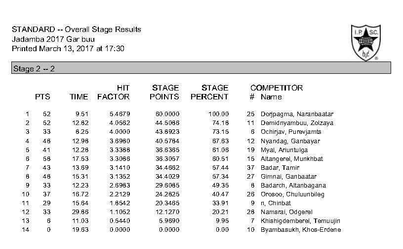 2017 оны 3-р сарын 12-ны Ням гаригт Монголын Практик Буудлагын Холбооны буудлагын талбай дээр МПБХ, Зэвсэгт Хүчний 084-р ангиас хамтран цэрэг, цагдаа, хүчний байгууллагуудын алба хаагч нарын дунд жил бүр уламжлал болгон зохион байгуулдаг дэслэгч генерал Ш.Жадамбын нэрэмжит “Монгол цэрэг 2017” тэмцээн хоёр дахь өдрөө үргэлжилж, амжилттай өндөрлөлөө. Энэ өдөр гар бууны төрлөөр тэмцээн явагдсан юм. Ингээд 3-р сарын 12-ны өдөр болж өнгөрсөн гар бууны тэмцээний дүнг дэлгэрэнгүй танилцуулъя.