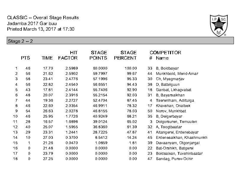 2-р дасгалын хувьд Макаров ангилалд Б.Болдбаяр, Стандарт ангилалд Д.Наранбаатар нар 100%-ийн амжилт үзүүлж бусдыгаа хошуучилжээ.