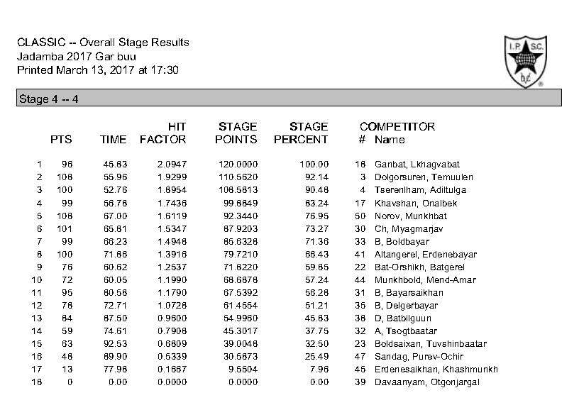 4-р дасгалын хувьд Макаров ангилалд Г.Лхагвабат, Стандарт ангилалд Д.Наранбаатар нар 100%-ийн амжилт үзүүлж бусдыгаа хошуучилжээ.