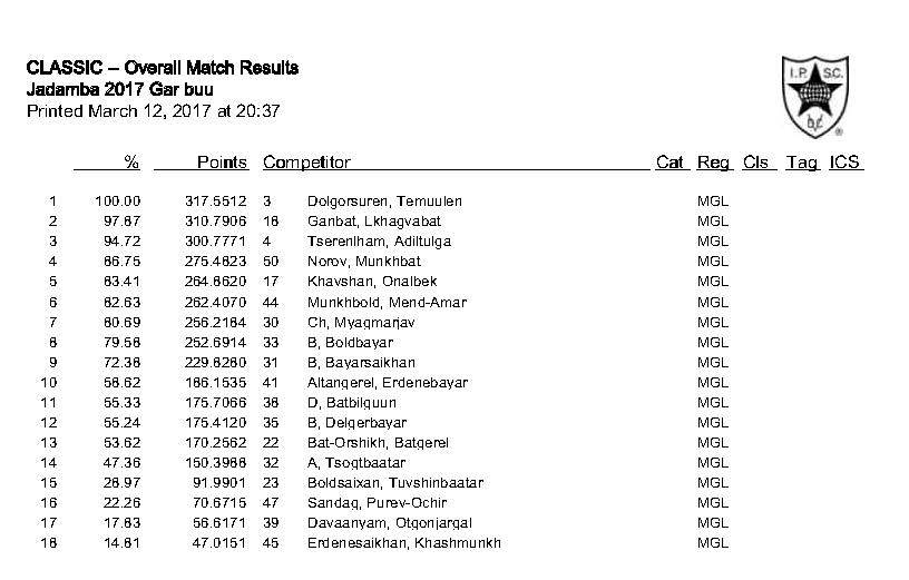 1-р дасгалын хувьд Макаров ангилалд Д.Тэмүүлэн, Стандарт ангилалд М.Ариунтулга нар 100%-ийн амжилт үзүүлж бусдыгаа хошуучилжээ.