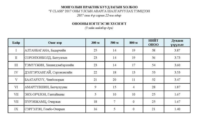 Ингээд эцсийн дүнг шалгаруулахад 58 оноогоор Б.Алтанбагана түрүүлж, 56 оноогоор Б.Соронзонболд дэд байр, 54 оноогоор Х.Тэмүүжин гуравдугаар байрыг тус тус эзэллээ. III байр эзэлсэн Х.Тэмүүжин өнгөрсөн жилийн УАШТ-нд мөнгөн медаль хүртэж байсан бол Б.Соронзонболдын хувьд МПБХ-оос зохион байгуулсан цэц буудлагын тэмцээнүүдэд тогтмол амжилт үзүүлдэг сайн буудагч билээ.