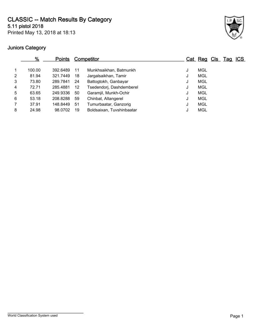 Ингээд эцсийн дүнг гаргахад гар бууны “Макаров” ангиллын тэмцээнд, явц дунд 2 буудагч дүрмийн алдаа гаргаж хасагдсан бөгөөд тэмцээнээ амжилттай дуусгасан 8 тамирчнаас М.Батмөнх алтан медаль, Ж.Тамир мөнгөн медаль, Б.Ганбаяр хүрэл медаль тус тус хүртлээ.