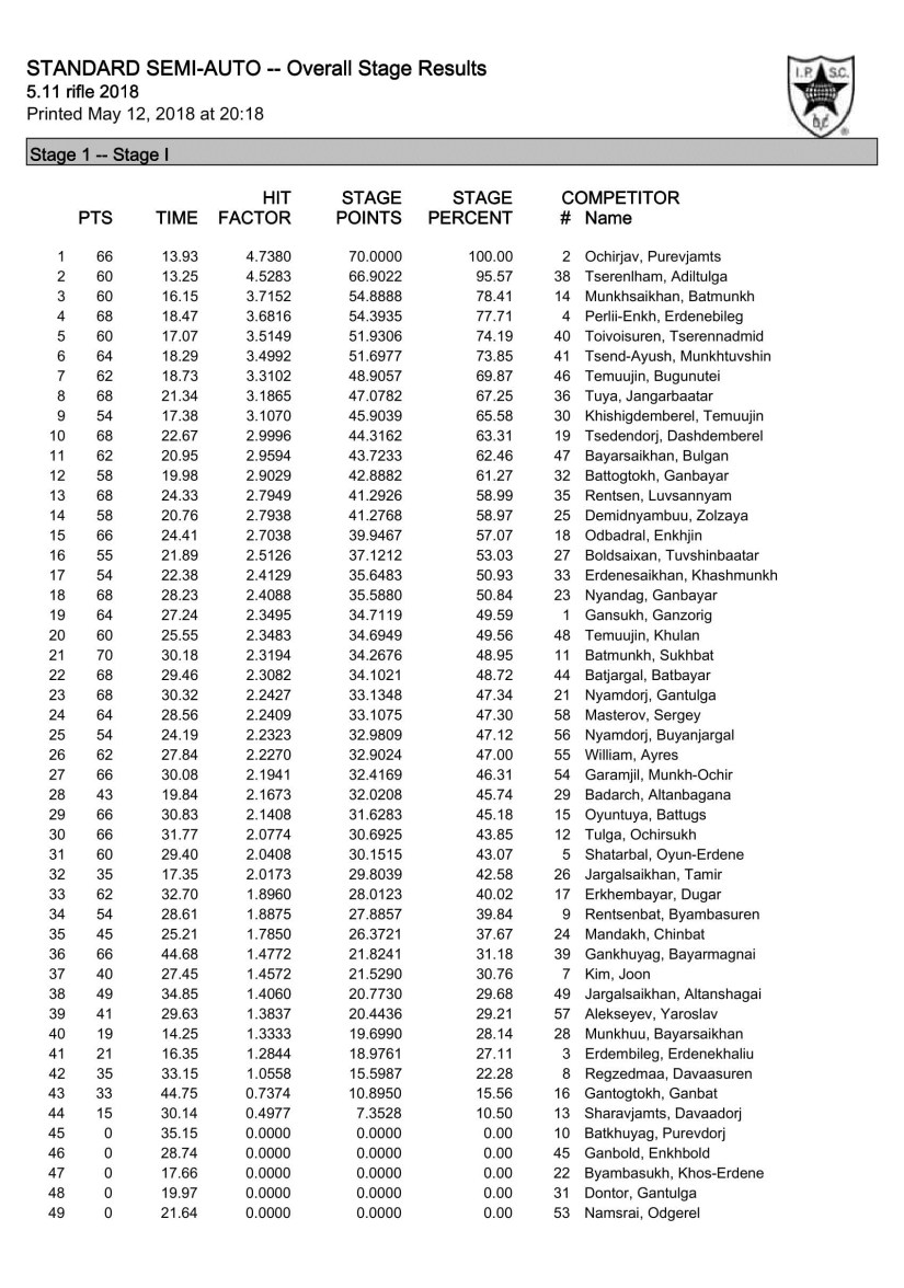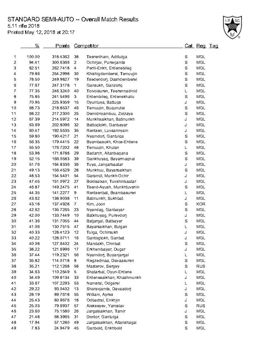 Ингээд эцсийн дүнг гаргахад явц дунд хасагдсан хүн гараагүй бөгөөд нийт 49 тамирчнаас спортын мастер Ц.Адилтулга 100%-ийн амжилтаар бусдыгаа тэргүүлжээ. Гэвч өмнө дурдсанчлан, тэмцээний удирдамжийн дагуу “Холбооны гишүүн”, “Гишүүн бус”, “Эмэгтэй” гэсэн 3 ангиллаар тэмцээнийг дүгнэсэн. Иймд оноог ангилал тус бүрд дахин дүгнэж эцсийн дүнг тодорхойлов.