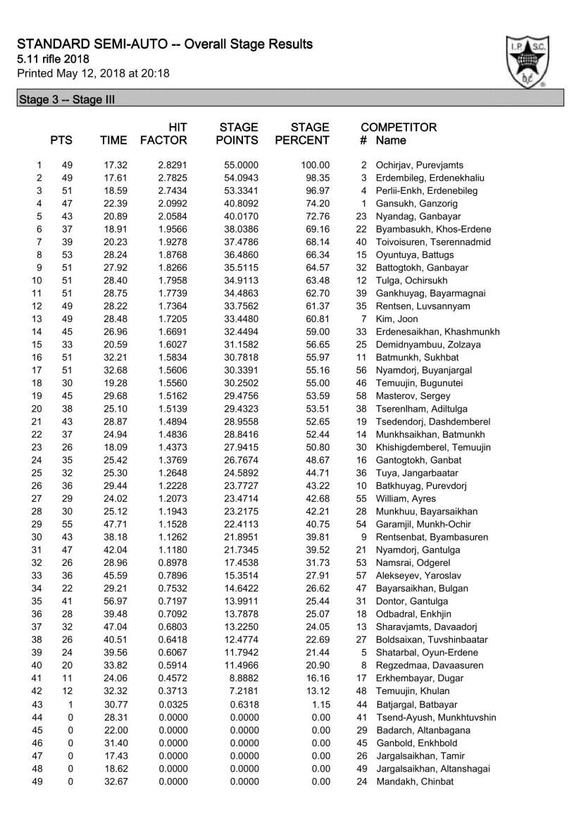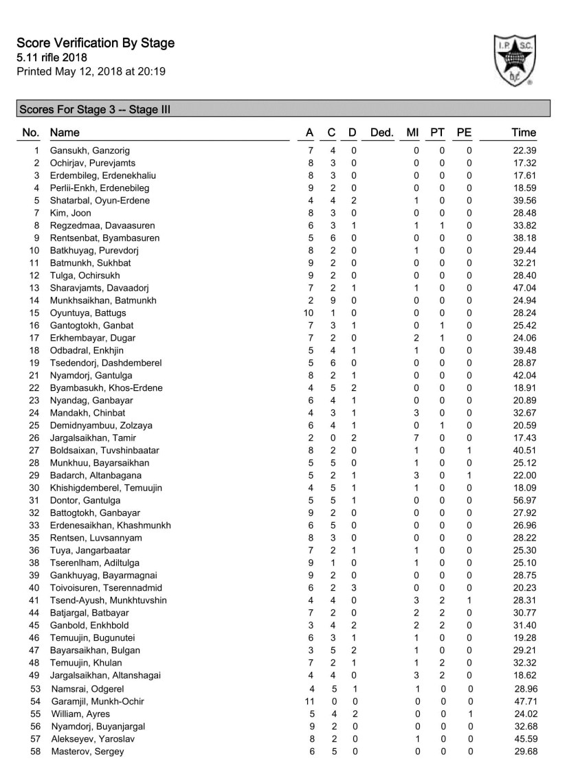 3-р дасгалын дүнг нэгтгэн дүгнэвэл спортын мастер О.Пүрэвжамц 100%-ийн амжилт үзүүлж, боломжит оноогоо бүтэн авч бусад нь түүний араас жагслаа.