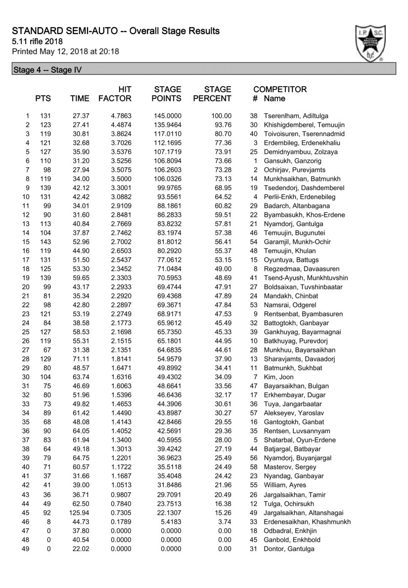 4-р дасгалыг нэгтгэн дүгнэвэл спортын мастер Ц.Адилтулга тус дасгалд тэргүүлсэн байна.