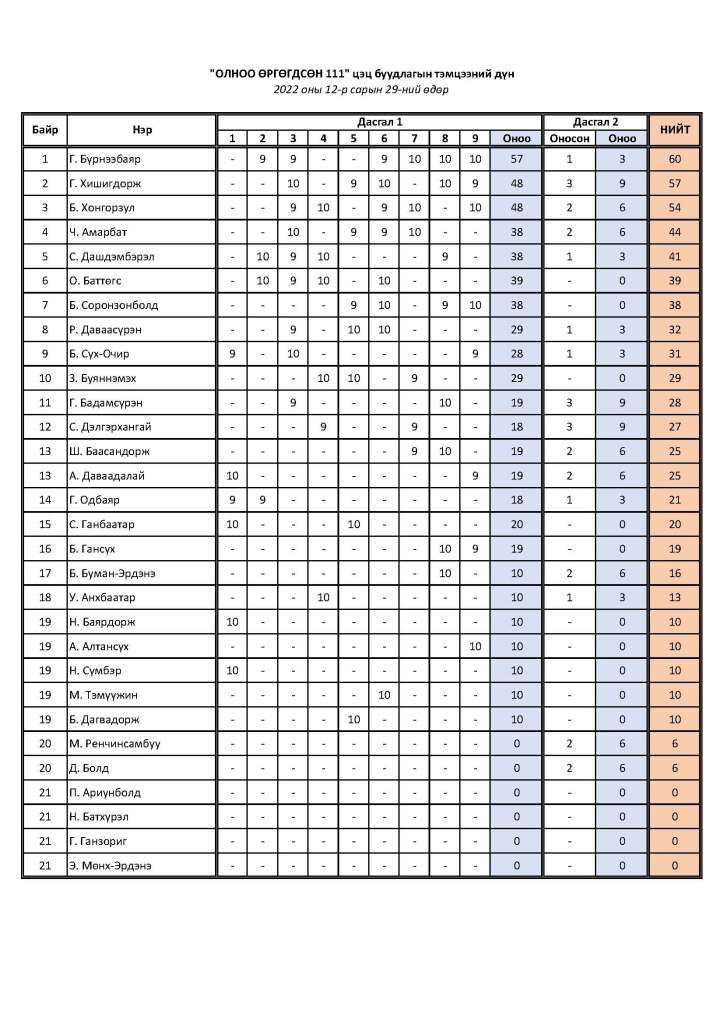 Дэд байрыг Г.Хишигдорж 57 оноогоор,