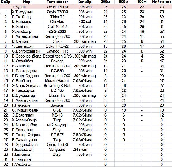 Дүрэм ёсоор 300м болон 500м-ийн буудлагын нийлбэр дүнгээр эхний 12 буудагч 800м-ийн буудлага хийсэн. Зарим буудагч өөрийн саналаар 500м-ийн буудлага хийгээгүй. Тус тэмцээний ганц эмэгтэй буудагч Т.Хулан хамгийн өндөр оноотой байсан боловч тэмцээний удирдамжид “галт зэвсэг дамжуулахгүй” заасны дагуу түүний оноог тооцоогүй юм.