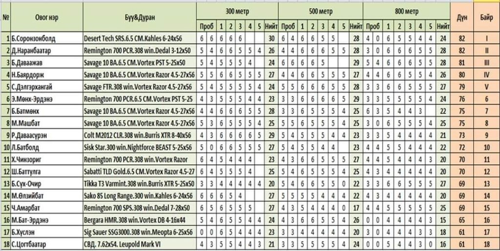 “F class” төрлөөр зохион байгуулсан энэ удаагийн тэмцээнд 18 мэргэн буудагч өрсөлдсөнөөс: